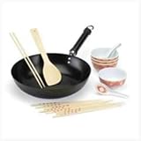 East meets West in a delicious blend of style! Asian delicacies are extra-special when prepared in this honest-to-goodness wok; matching tableware makes any meal an exotic adventure. 16 piece set. Set includes wok, booklet with authentic recipes and spatula; four each of bowls, spoons and pairs of wooden chopsticks. Wok: Steel/enamel with Teflon interior, heat insulated handle, 11" diameter x 31/4" high, hand wash. Bowls: melamine, 4